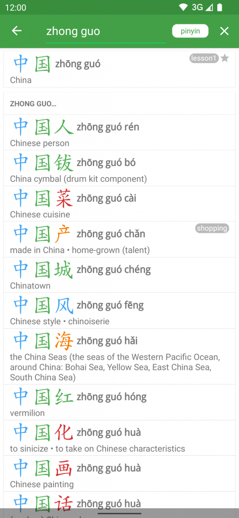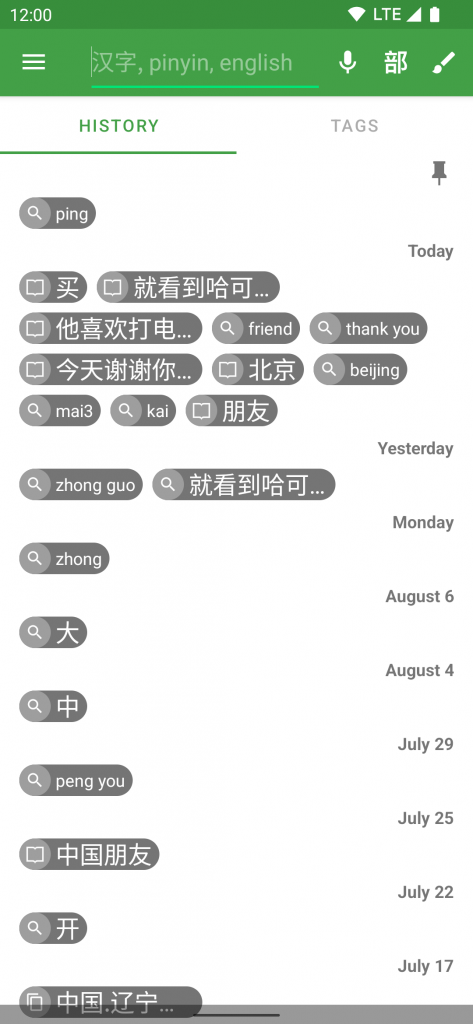 - Brand new history screen where searches are grouped by date. Each item indicates whether it is a textual search (magnifying glass icon) or dictionary lookup Chinese word. You can pin items to the top. You can also delete items individually or by date etc.