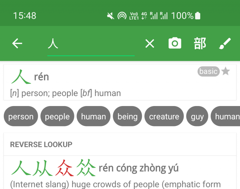 - Convenient related English search buttons below exact match search result. (e.g. person, people, human etc in screenshot below)