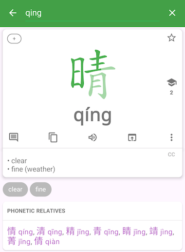 Phonetic Relative: A character that shares the same phonetic component as the headword. While this shared component is usually evident, historical sound changes and the character simplification process may sometimes obscure the connection.